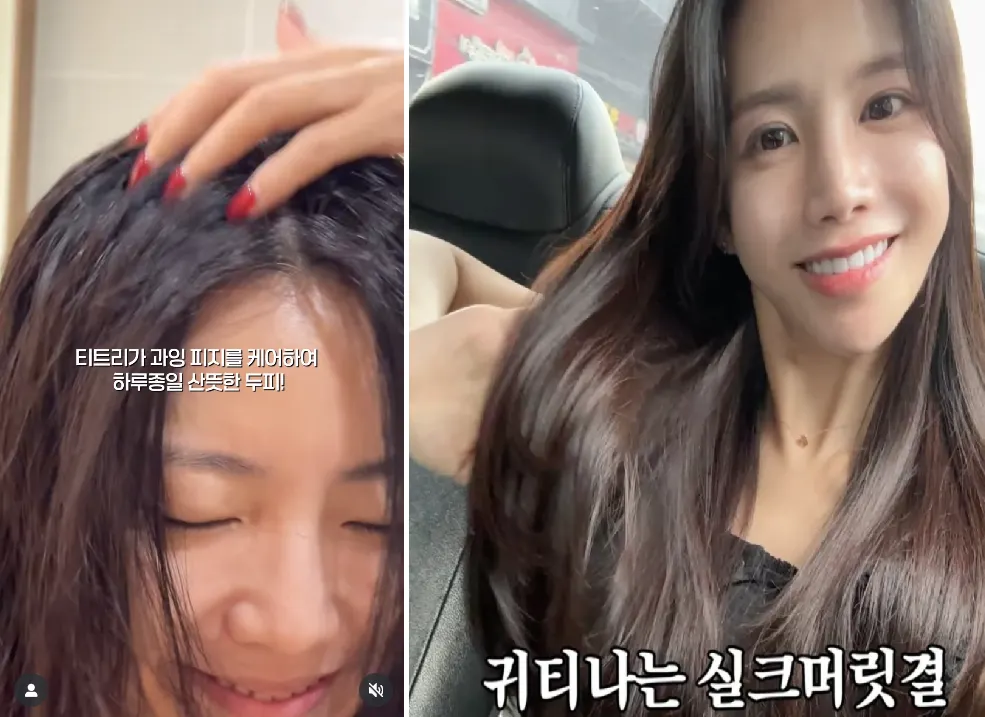 必須④) シャンプー/トリートメント後、頭皮と髪に満足している様子で動画を締めくくる。