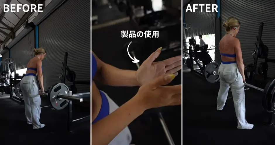 前後比較を一目で確認(BEFORE/AFTER字幕必須) → 製品使用の前後でグリップ力が向上することを視覚的に示すことがポイントです。