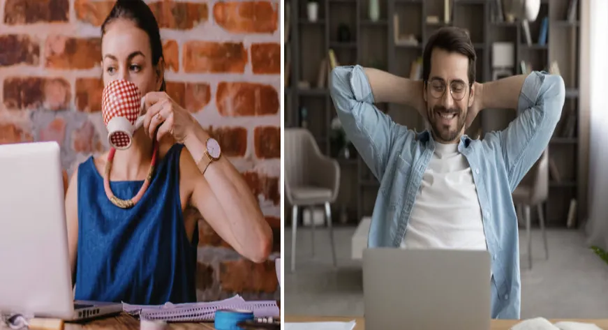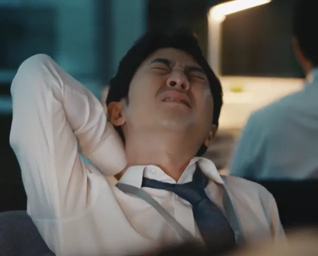 必須STEP①)机の前で疲れた表情、目をこすったりあくびをしたりして疲れている様子の演出で始めてください。