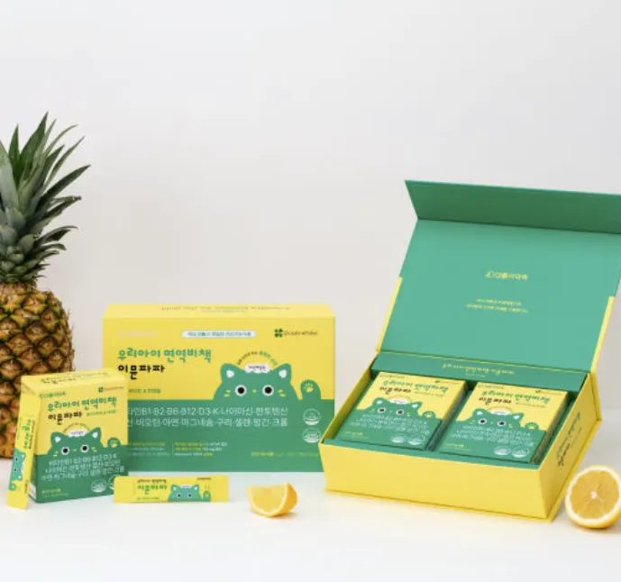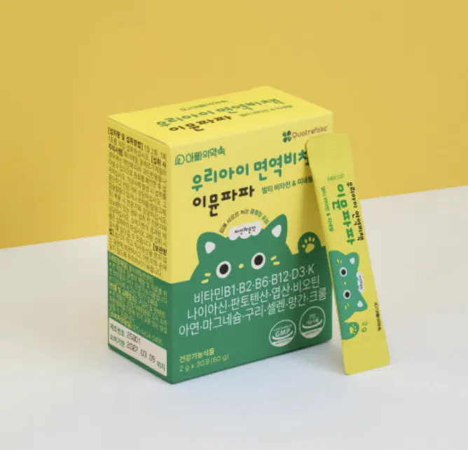 キャンディー、お菓子、ゼリーなどの間食を多くする子どもの体内の炎症を抑え、ビタミン・ミネラル・免疫に役立つ成分が1包に配合された製品。