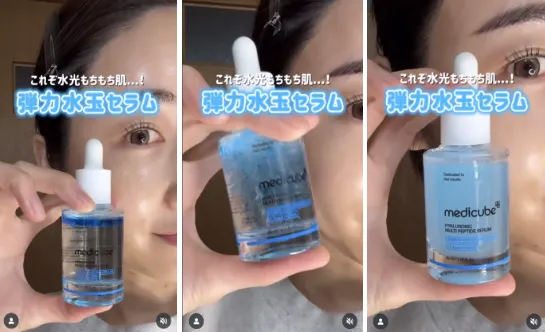 開いた毛穴の肌をクローズアップ → セラムをなじませるシーン → ツヤが満ちていく肌の表現