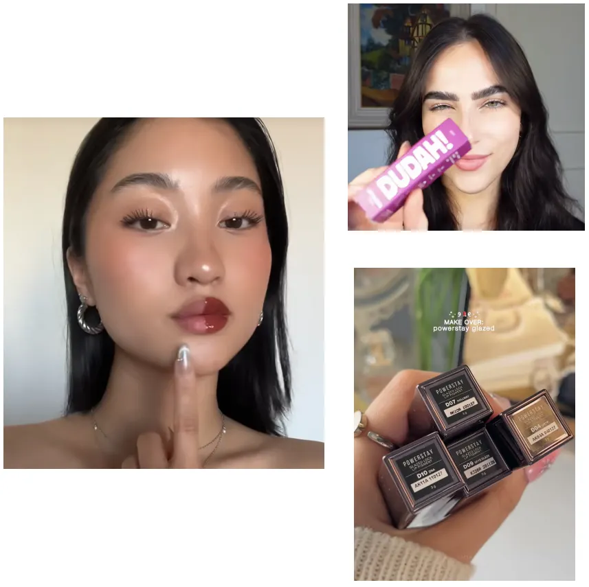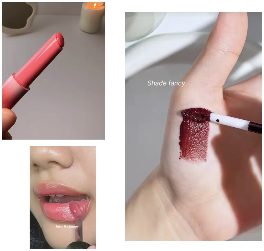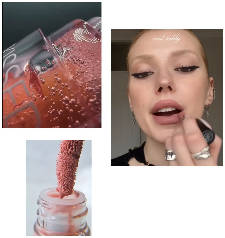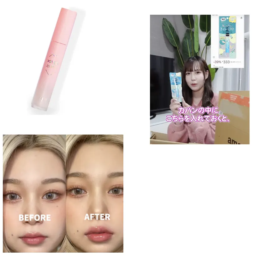 インフルエンサーが唇の半分に製品を塗って、ちょっと驚いた表情でインパクトを出します。