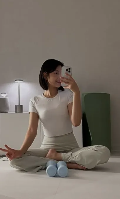 リラックスできるトレーニングウェアで撮影を進めてください。