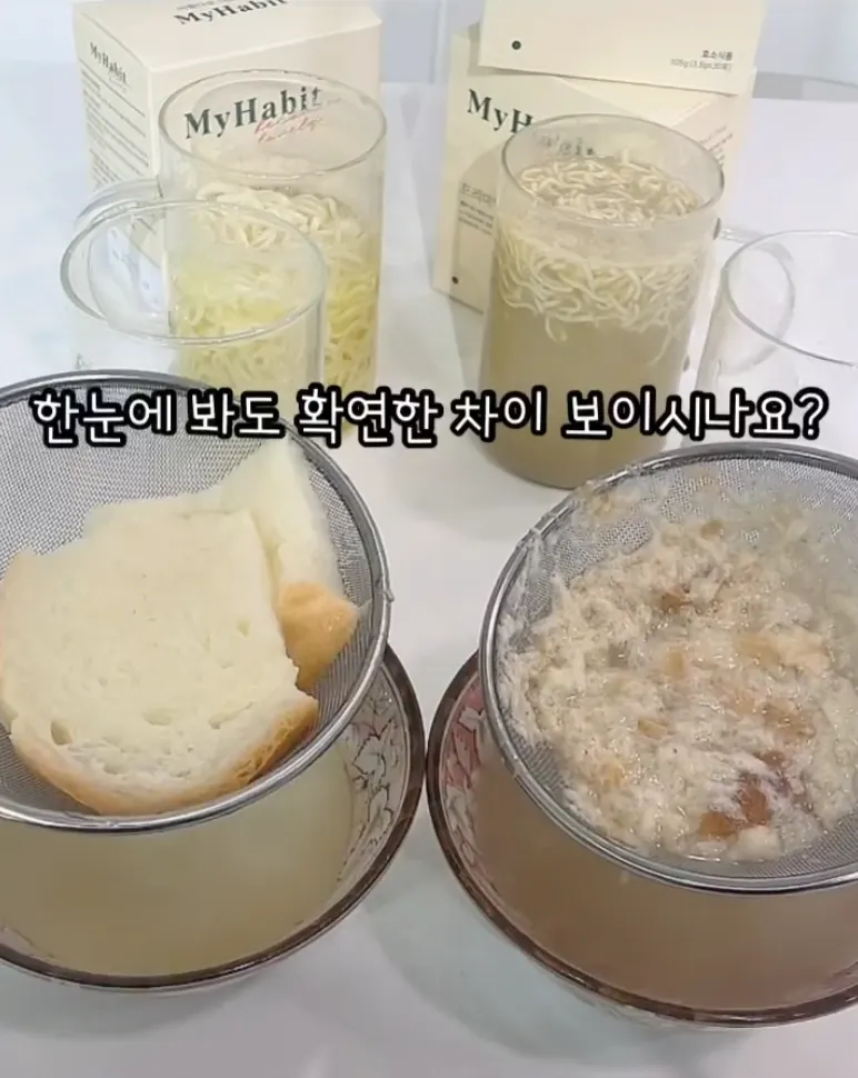 必須STEP④) ザルでこし、酵素パウダーを入れた食品が早く分解されたことを強調してください。