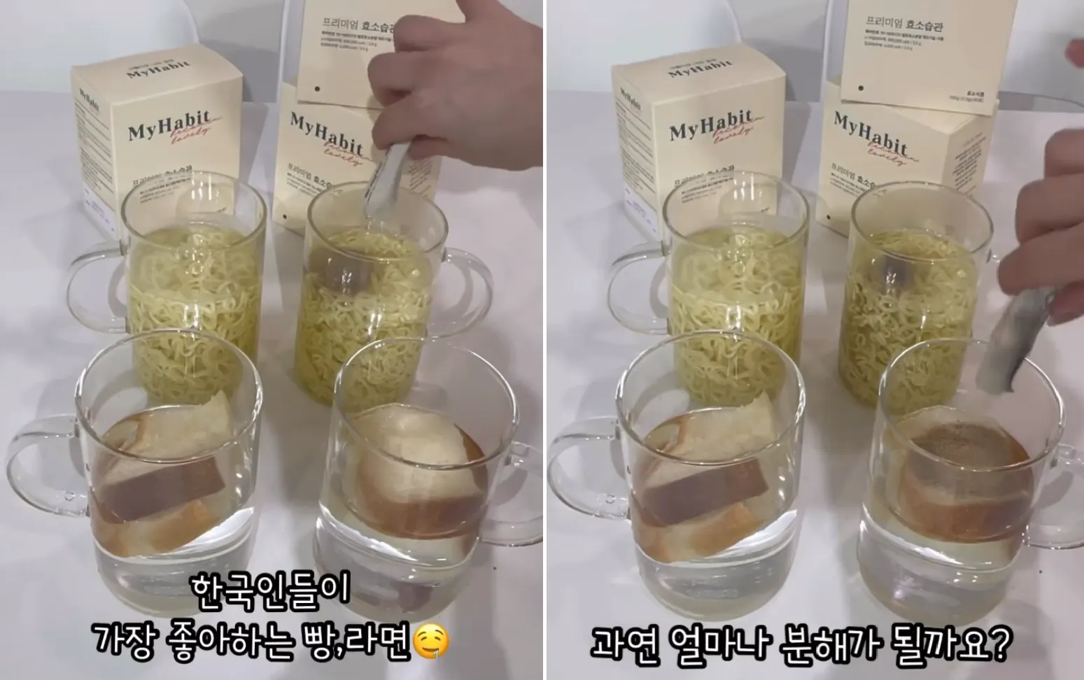必須STEP②) 2種類の食品を冷たい水と一緒に透明な容器に入れて準備し、右側にのみ酵素パウダーを入れて実験を行ってください。