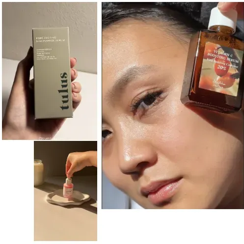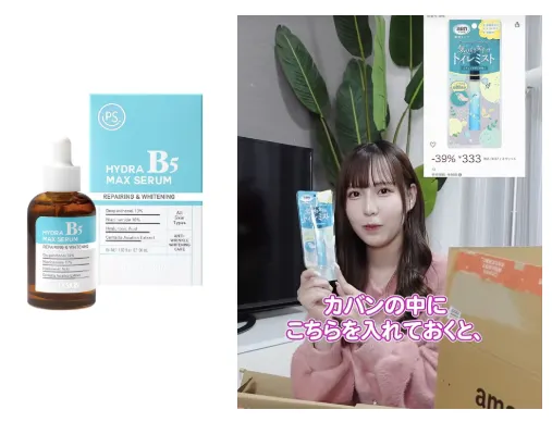 「使用後、肌が本当にしっとりしました。」「デイリースキンケアルーティンにぴったり!」「Amazon JapanでPRETTYSKIN ナイアシンアミド10%+ビタミンB5美容液を検索」のようなPR字幕を追加。