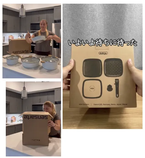 そのまま箱のパッケージと開封シーンを続けて見せてください。